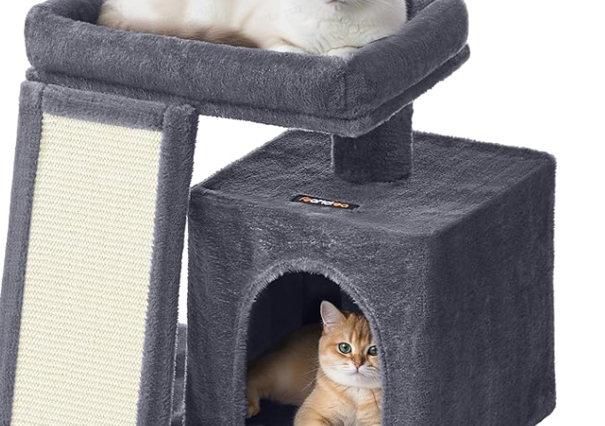 • This Feandrea cat tree is very similar to the one I featured in this article. The only difference is it has a more traditional cat scratching post rather than a pad. And the cat cave is rounded, not square. The top supportive perch also looks super plush, which might be really nice for older cats to feel even more comfortable.